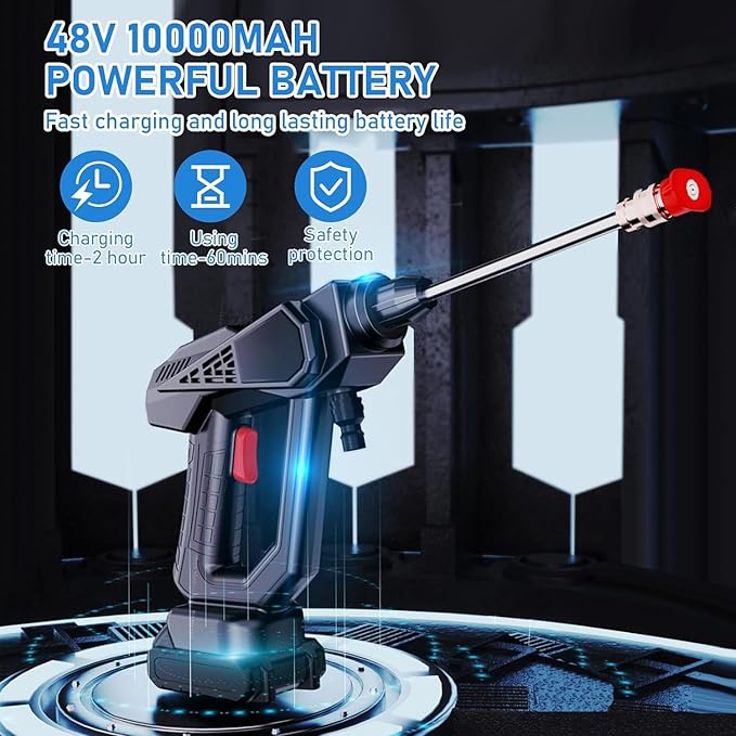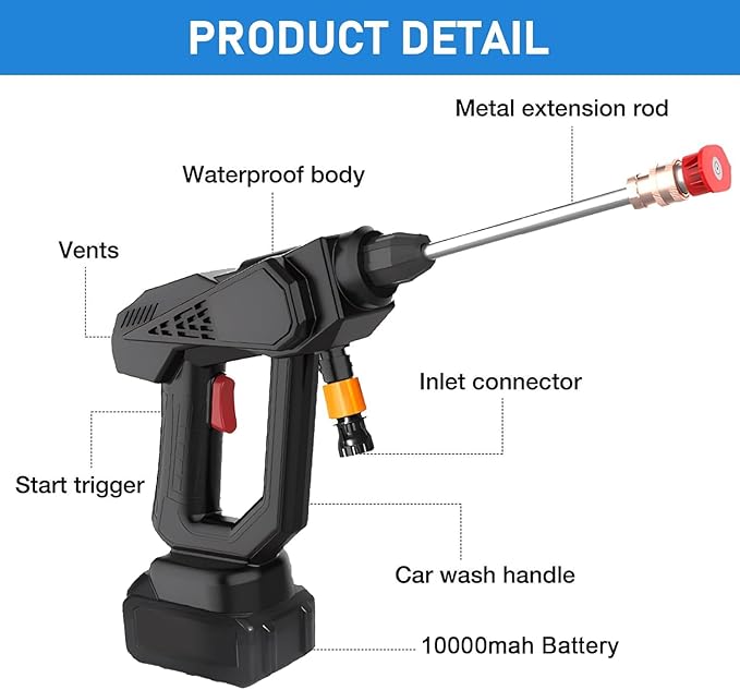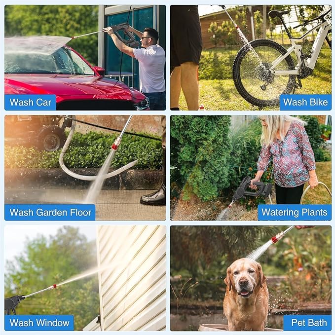- Wide Application: The rechargeable high pressure washer gun is free from wires and can be used freely outdoors. The rechargeable high pressure washer is suitable for watering plants, cleaning vehicles, gardening tools, bicycles, windows, walls, floors, bathrooms, perfect for a variety of cleaning tasks in the home and garden. (Note: not as effective on solid dirt)