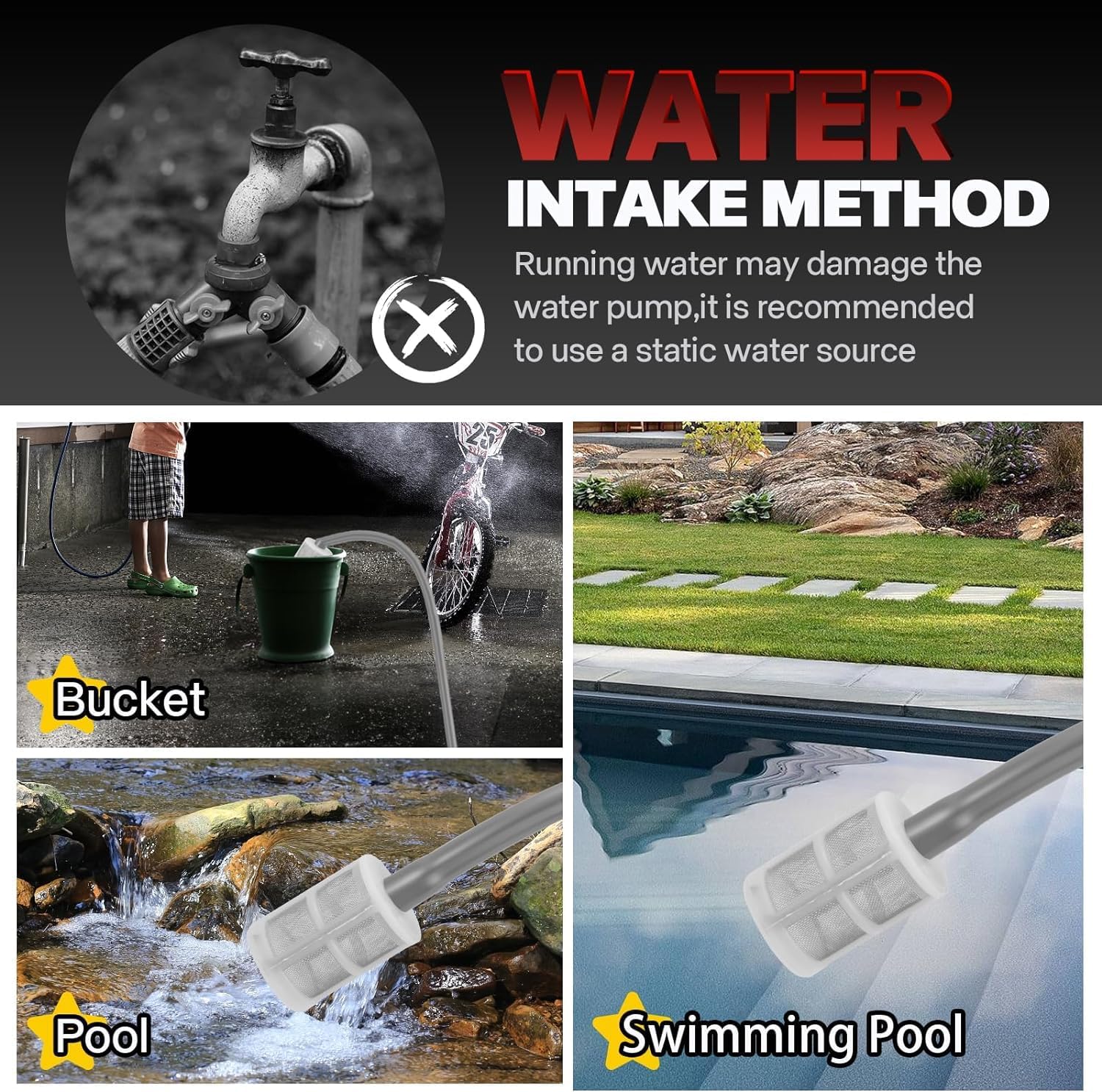 سحب الماء من أي مكان: غسالة ضغط لاسلكية مزودة بسلة فلتر وخرطوم بطول 16.5 قدم، تُرشّح بفعالية الشوائب والجزيئات وأوراق الشجر والرواسب، ما يُتيح لك الحصول على الماء بسهولة من دلو/بركة سباحة/نهر؛ كما يسمح لك موصل الزجاجة بسحب الماء من الزجاجة.