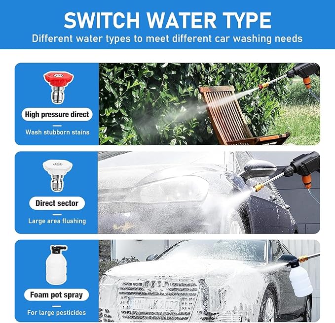 - MULTIFUNCTIONAL 6-IN-1 NOZZLE: Lightweight cordless pressure cleaner is equipped with a multifunctional nozzle with 6 spray modes, 0°/15°/25°/40°/fan/shower mode. In addition, the power washer is matched with a foam pot that produces a dense foam, making it easy to clean cars or floors.