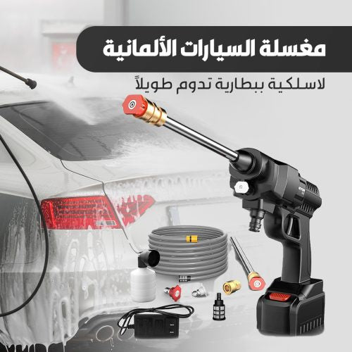 غسالة ضغط صغيرة: غسالة ضغط لاسلكية قوية تستخدم محركًا نحاسيًا نقيًا عالي الأداء بقوة 250 واط، ويبلغ أقصى ضغط ماء لها 2.5 ميجا باسكال، مع سرعة رش 4.5 لتر/دقيقة، مما يوفر طاقة كافية للتنظيف الخارجي وراحة التشغيل اللاسلكي.