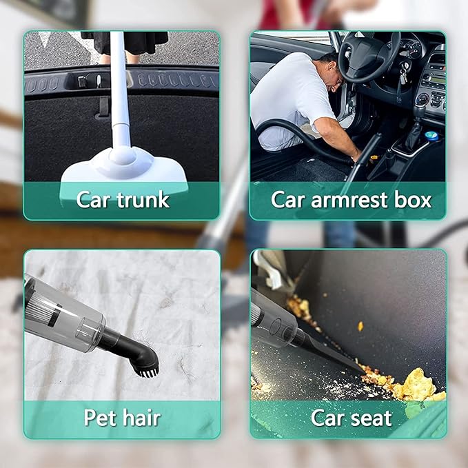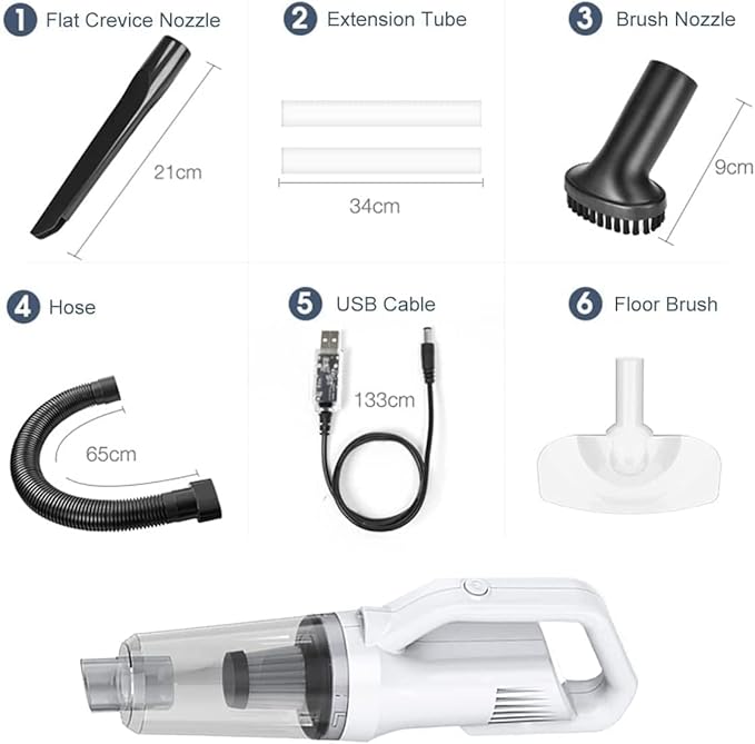 - 【4 in1 Clean Professional accessories】The cordless hand vacuum rechargeable with wet-dry use and comes with 1*dusting brush, 1*crevice nozzle tool, 1*hose, 1* washable filter, 1*floor brush, 2* connect tools, used for narrow gaps and corners that are difficult to reach. The brush for cleaning hair and pet hair on carpets, long hose can clean hidden and deep corners of cars and warehouses, floor brush can clean floors and curtains. All meet your requirements for home and car cleaning.
