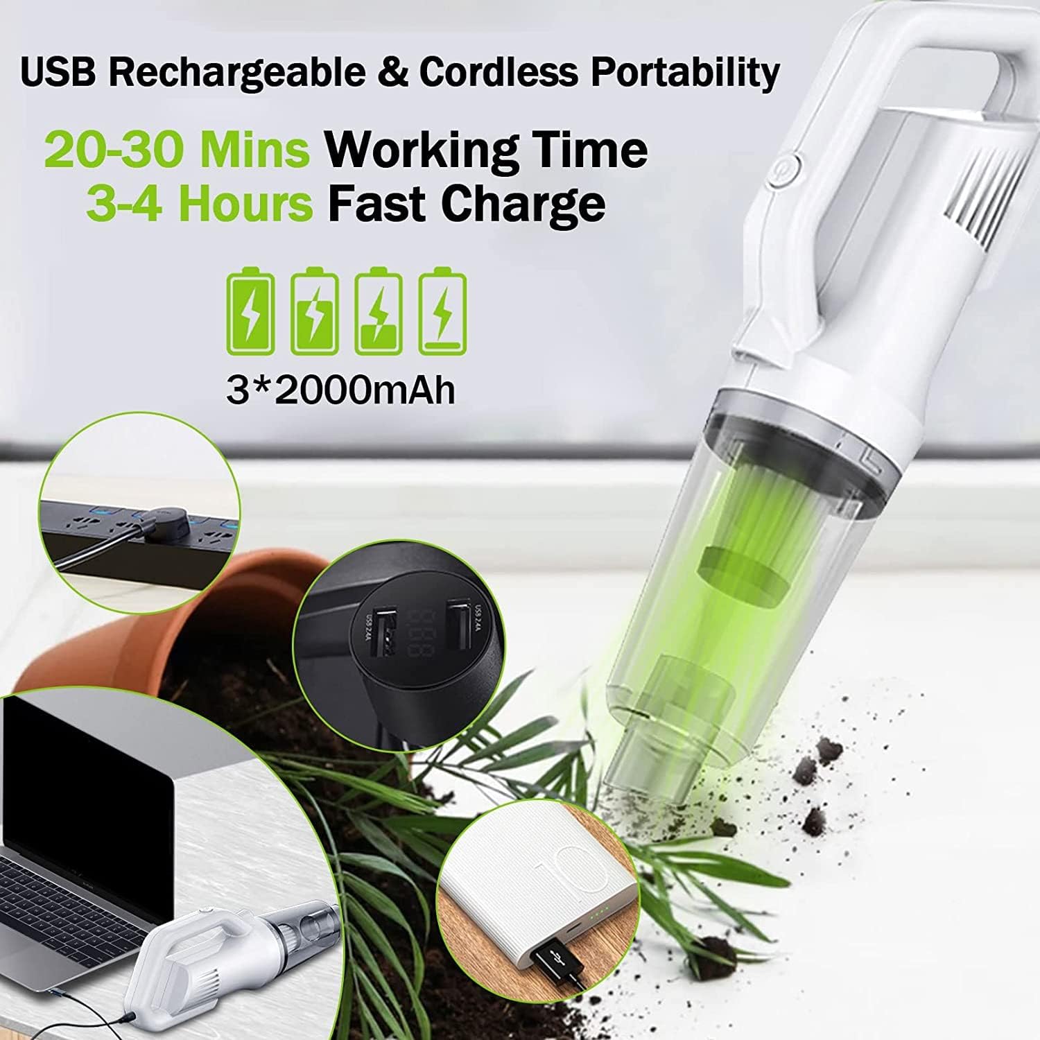 - 【Long Working Time & 3*2000MAh Battery】Our handheld vacuum cleaner uses a large-capacity 3*2000mah battery, which can work continuously for 20-30 minutes and be fully charged in 3-4 hours. Mini vacuum cleaner has temperature protection, current and voltage protection to ensure the safety of the device during the entire charging process.