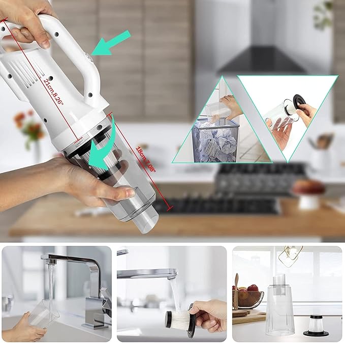 - 【Upgraded HEPA Filter】This mini vacuum equipped with a washable HEPA filter, which can capture 99.99% of particles, effectively protect the motor and prevent secondary air pollution. When the dust container is full, you only need to rotate it to take out the trash, and then put it under water to clean and dry.